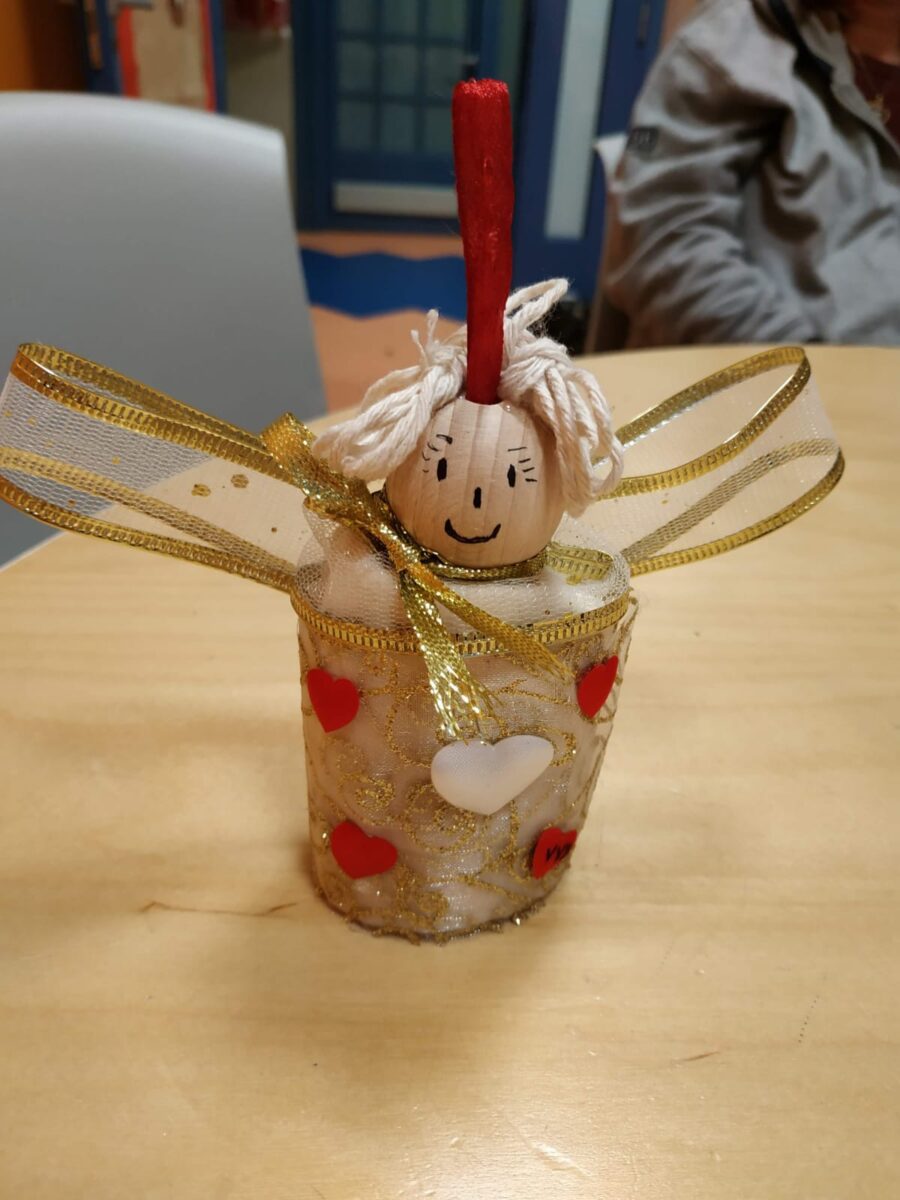 Tiro fuori subito tutto il materiale ed iniziamo, il tempo passa velocemente, mi sembra di tornare bambina, dimentico l’ansia, il posto dove sono, dimentico tutto e magicamente sono io a divertirmi più di loro, prepariamo talmente tanti angioletti che addobbiamo anche l’albero del reparto oltre che a confezionare regalini per mamme e nonne, la scelta dei bambini converge solo verso il ramo femminile ovviamente!