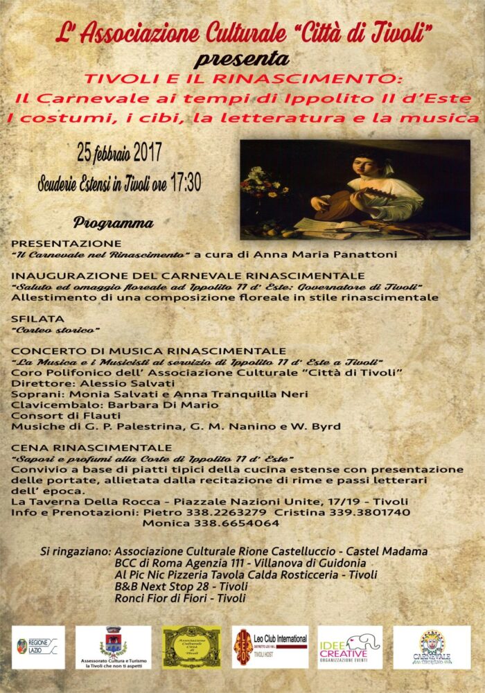 L’Associazione Culturale “Città di Tivoli” presenta TIVOLI E IL RINASCIMENTO: il Carnevale ai tempi di Ippolito II d’Este. I costumi, i cibi, la letteratura e la musica. L’evento si terrà sabato 25 Febbraio 2017 alle ore 17:30 presso le Scuderie Estensi.