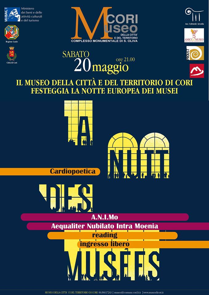 Il Museo della Città e del Territorio di Cori ha aderito alla Notte Europea dei Musei 2017. Per l’occasione, sabato 20 Maggio, dalle ore 21:00, la Direzione scientifica museale, dall’Associazione Culturale Arcadia e il Comune di Cori hanno organizzato un’apertura straordinaria, con ingresso gratuito e visita guidata, che consentirà un’insolita ed emozionante fruizione notturna dell’Istituto Culturale ospitato nei locali del Cinquecentesco ex Convento Agostiniano, eretto per volontà del frate corese Ambrogio Massari.