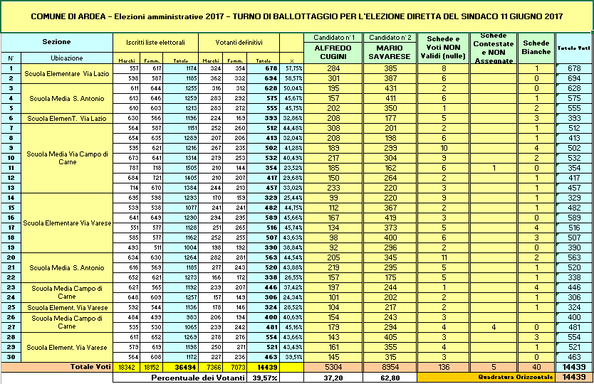 L’affluenza definitiva per il turno di ballottaggio delle elezioni comunali è stata del 39,83%. Hanno votato 14437 cittadini.