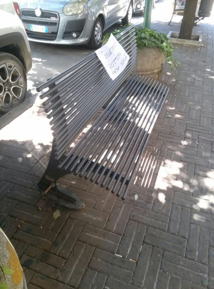 “Non sedetevi: è rotta e vi fate male” questa la simpatica scritta su un foglio che indica ai cittadini di non sedersi sulla panchina rotta in via Turati. La panchina è in questo stato da almeno una settimana e, onde evitare che qualcun altro si faccia del male, probabilmente un saggio cittadino ha scelto di apporre una simpatica segnalazione. La parte posteriore è infatti sollevata da terra poiché alcuni viti si sono separate dal terreno. Evidentemente, qualcuno aveva provato a sedersi, salvo poi scoprire l’instabilità della panchina. Per non far provare la brutta esperienza ad altre persone ha così scelto di scrivere su un foglio di carta il simpatico monito. Ovviamente, si tratta di una segnalazione simpatica, ma che rendiamo pubblica per far sì che la panchina venga saldata a terra quanto prima.