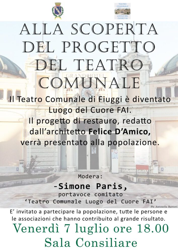Venerdì 7 luglio alle ore 18 presso la sala consiliare si terrà la presentazione del progetto di restauro del Teatro Comunale redatto dall’architetto Felice D’Amico. Modera Simone Paris, portavoce del comitato “Teatro Comunale Luogo del Cuore FAI”.