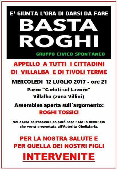 I cittadini di Tivoli e Villalba sono infatti invitati a partecipare all’assemblea aperta sui roghi tossici. Il pubblico dibattito si terrà mercoledì 12 luglio 2017, alle ore 21:00, presso il parco Caduti sul lavoro di Villalba (zona Villini). Durante l’assemblea sarà resa nota anche la denuncia che verrà presentata all’Autorità giudiziaria. Di seguito, il manifesto ufficiale dell’evento, credo dal gruppo civico spontaneo.