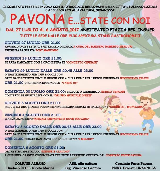 “Pavona E…State con Noi”, a cura dell’Assessorato alla Cultura, Turismo e Spettacolo e del Comitato Feste di Pavona, vedrà l’anfiteatro di Piazza Berlinguer animarsi a partire da giovedì 27 luglio, quando alle ore 21 si terrà il “Pavona Dance Festival” con la direzione del Maestro Roberto Mercuri. Ritmo a passi di danza, anche il giorno successivo, con l’orchestra di Concetto Cipriani. Sabato 29 luglio sarà la volta dell’orchestra spettacolo “I nero 01”. La serata sarà preceduta da intrattenimento per i più piccoli a cura dell’associazione ludico culturale “L’ippopotamo felice”. Domenica 30 luglio tributo in memoria di Enrico Vergari con il concerto del “Gruppo Musicale Inside”. Si riparte giovedì 3 agosto con la serata di ballo in compagnia dei “Cugini di… Montagna”. Venerdì 4 agosto cinema all’aperto con “Animali Fantastici e dove trovarli”. Sabato 5 agosto torna l’intrattenimento per i più piccoli a cura dell’associazione “L’ippopotamo Felice”. A seguire alle 21, serata danzante con l’orchestra “Melody”. La manifestazione si chiuderà domenica 6 agosto con l’esibizione dell’orchestra spettacolo “Denise e Claudio”, accompagnata dalla cocomerata.
