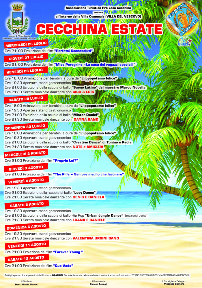 Si partirà mercoledì 26 luglio alle ore 21 con la proiezione del film “Perfetti Sconosciuti”. Si proseguirà il giorno dopo con il film “Miss – Peregrine – La casa dei ragazzi speciali”. Venerdì 28 luglio dalle ore 18 animazione per bambini a cura dell’associazione “L’ippopotamo felice”. A seguire alle ore 21 e 21.30 le esibizioni della scuola di ballo “Sueno Latino”, guidata Maestro Marco Nocella, e della “Dayna Band”. Stesso programma sabato 29 luglio, eccezion fatta per l’esibizione alle 21 della scuola di ballo “Mister Daniel”. Animazione a cura dell’associazione “L’ippopotamo felice” anche domenica 30 luglio a partire dalle ore 18. A seguire dalle 21 l’esibizione della scuola di ballo “Creative Dance” di Tonino e Paola e la serata musicale danzante “Note d’Amicizia”. Si riprende mercoledì 2 agosto con la proiezione di “Proprio Lui?”. Il giorno successivo spazio al film “The Pills – Sempre meglio che lavorare”. Venerdì 4 agosto dalle 21 le esibizioni della scuola di ballo “Lucy Dance” e degli artisti “Denis e Daniela”. Sabato 5 agosto, alla stessa ora, ritmo Hip Pop con la “Urban Jungle Dance”. A seguire serata musicale danzante con Luana e Daniele. Ad animare la serata di domenica 6 agosto, dalle 21, sarà la “Valentini Urbini Band”. La manifestazione si chiuderà con le serate di venerdì 11 e sabato 12 agosto, con le proiezioni dei film “Forever Young” e Quo Vado”.