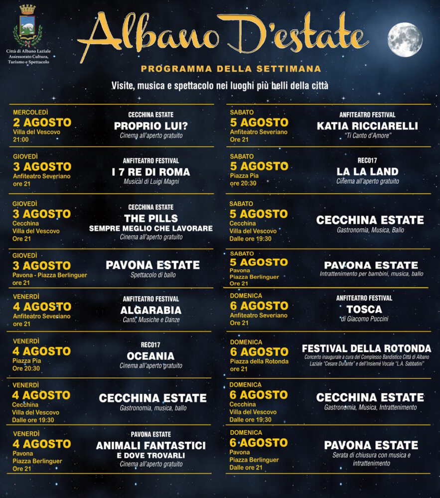 Ancora una settimana di grande eventi ad Albano Laziale. Ogni giorno un’offerta diversa che allieta le calde serate della cittadina castellana. Si inizia mercoledì 2 agosto con Cecchina Estate e il cinema all’aperto gratuito a Villa del Vescovo dove verrà proiettata la simpatica commedia “Proprio Lui?”. Giovedì 3 agosto ritorna l’Anfiteatro Festival con il musical di Luigi Magni, “I 7 Re di Roma”; a Cecchina Estate ancora cinema all’aperto gratuito con “The Pills – Sempre meglio che lavorare”; a Pavona Estate, Piazza Berlinguer, grande spettacolo di ballo. Venerdì 4 agosto ritorna la rassegna cinematografica estiva a Piazza Pia con il film di animazione per bambini “Oceania”.