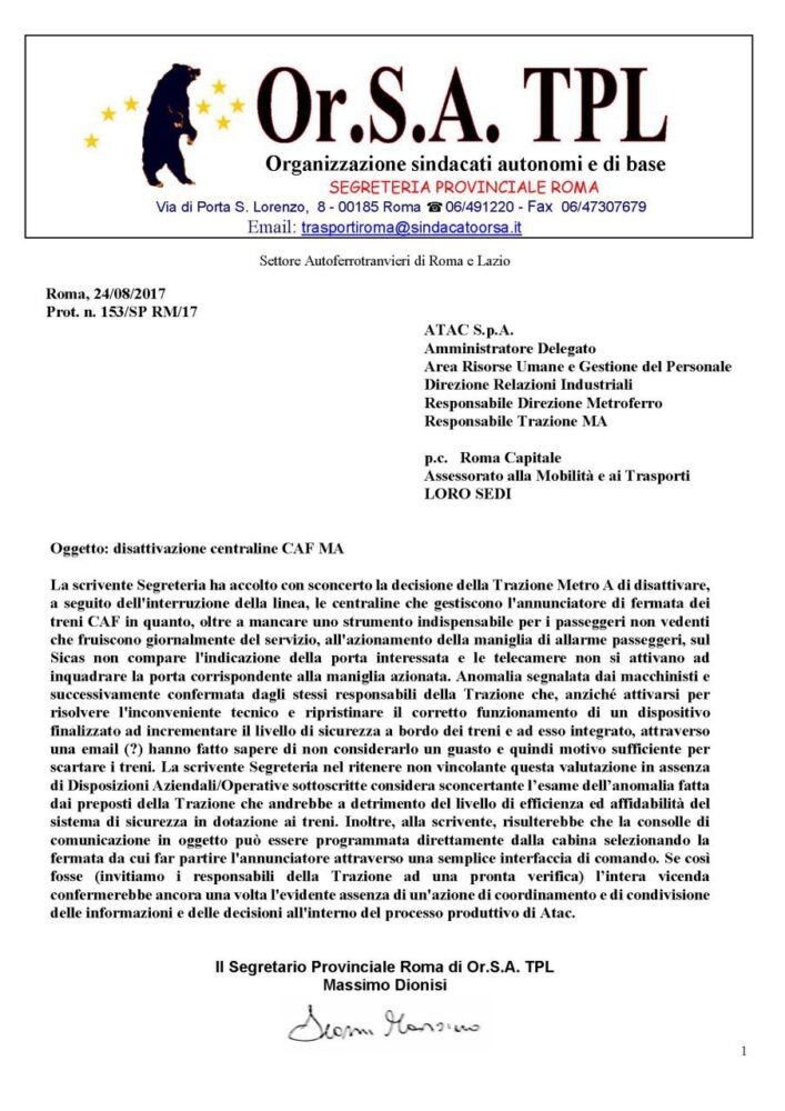 Ecco la note dell’Or.S.A Tpl, Organizzazione sindacati autonomi e di base, in merito alla dismissione da parte di Atac delle centraline che gestiscono gli annunci delle fermate. Ecco cosa dice.