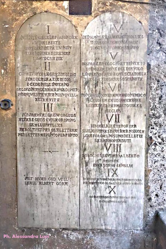 Di primo impatto, ciò che colpisce il visitatore che si trova di fronte alla inconsueta residenza sono gli affreschi esoterici e mistici, ma soprattutto le lapidi con iscrizioni (in approssimativo latino, italiano e svedese) che realizzò, come si racconta, durante gli anni di permanenza ad Anagni, in preda ad un’alternanza tra inquietanti allucinazioni e illuminanti visioni.