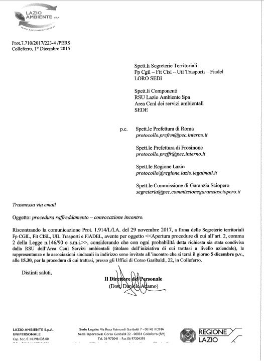 Continua a rimanere piuttosto tesa la situazione all’interno di Lazio Ambiente, con i lavoratori sul piede di guerra e ancora in attesa degli stipendi di novembre. Dopo le minacce di sciopero dei giorni scorsi e la volontà da parte di sindacati e associazioni di intraprendere azioni legali a difesa dei propri interessi, la dirigenza ha convocato per la giornata di domani – martedì 5 dicembre 2’17 – un incontro con oggetto la procedura di raffreddamento, che si terrà presso gli uffici di Corso Garibaldi.