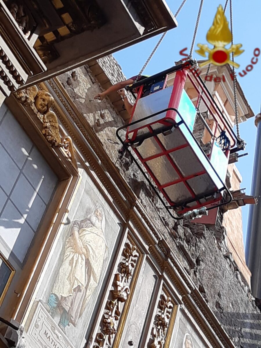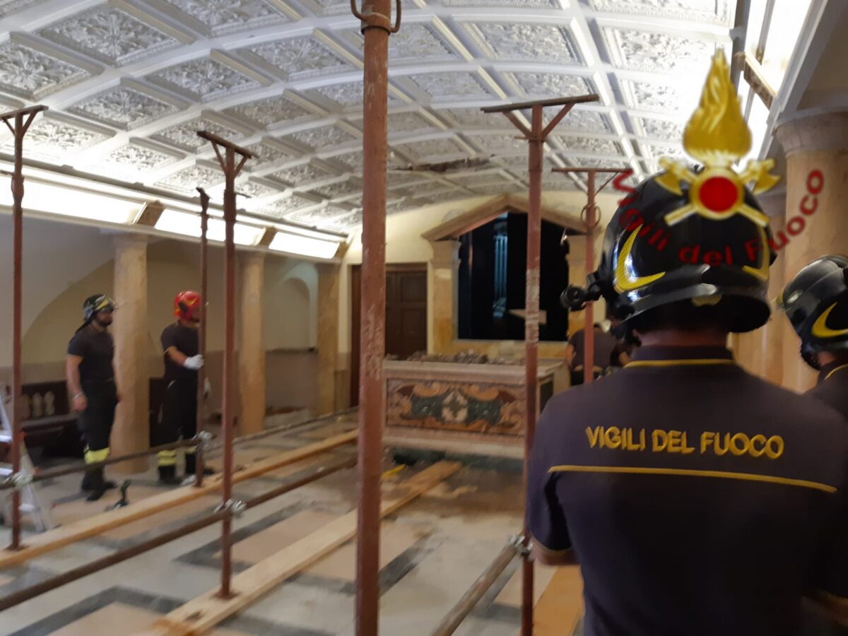 Dopo aver rimosso e messo in sicurezza tutte le opere d’arte, continua l’opera di rimozione delle parti in imminente pericolo di caduta e di puntellamento di spazi adiacenti al crollo. Già da ieri sera si è effettuata la posa di una copertura per le macerie all’interno della struttura ecclesiastica, mentre dalle prime luci dell’alba si sta provvedendo alla copertura temporanea della struttura.